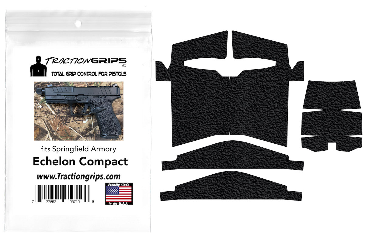 Tractiongrips embossed rubber grip tape overlay for Springfield Armory Echelon Compact. Includes an overlay that wraps and the front of the grip, covering the front and sides, a piece to cover the back, and two pieces to cover magazine pinky extensions.