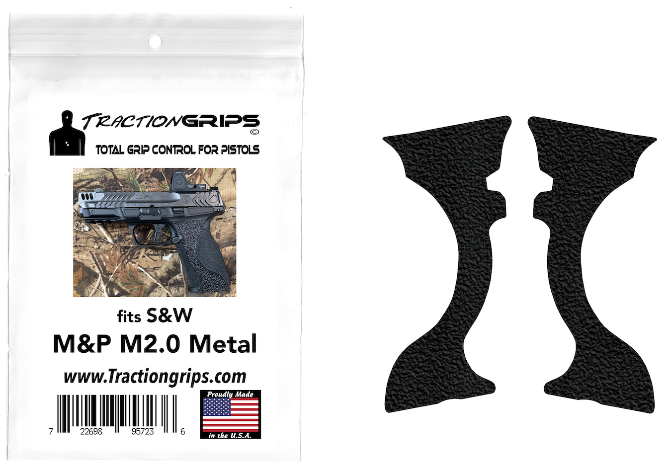Tractiongrips embossed rubber grip tape overlay for Smith & Wesson M&P 9 M2.0 Metal frame models. Includes overlays to fit the right and left sides, covering the exposed metal.